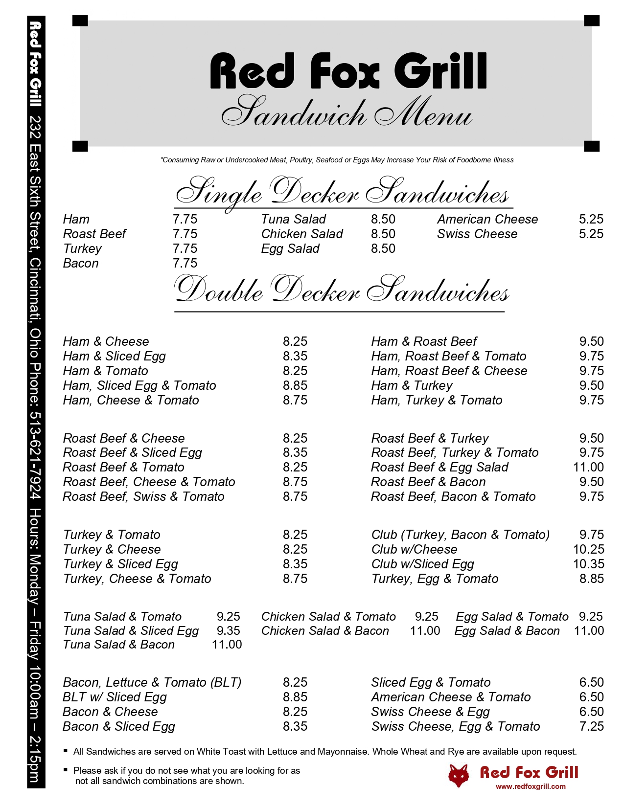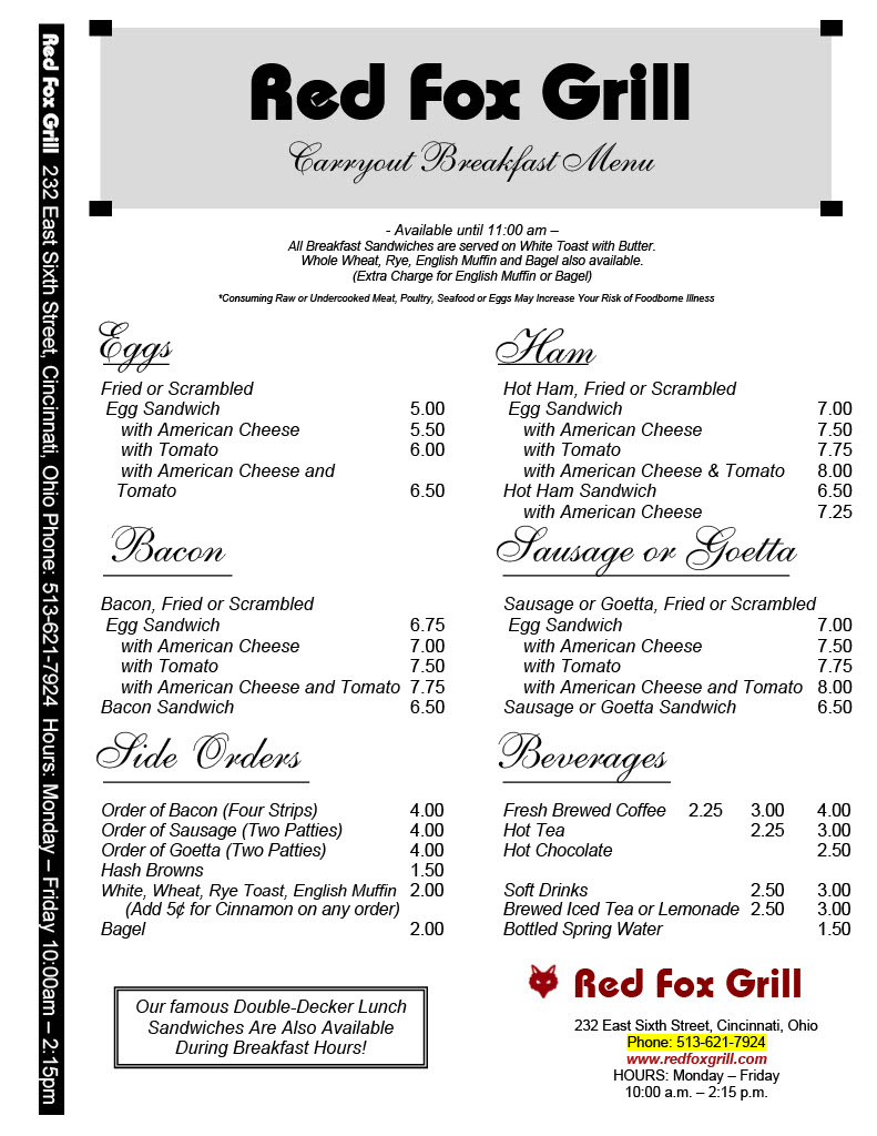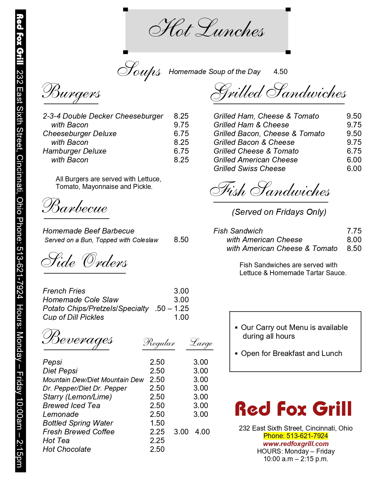 Carry Out Menu Dine In MenuContact Us " Contact Us 513-621-7924 232 East Sixth Street Cincinnati, Ohio Hours MON – FRI10:00am – 2:15pm SAT - SUNWe are closed